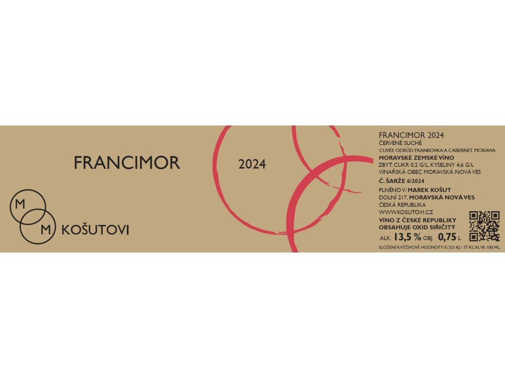 Francimor 2024 je naše cuvée Frankovky a Cabernetu Moravia (odrůdy, která byla vyšlechtěna přímo v Moravské Nové Vsi panem Lubomírem Glosem).